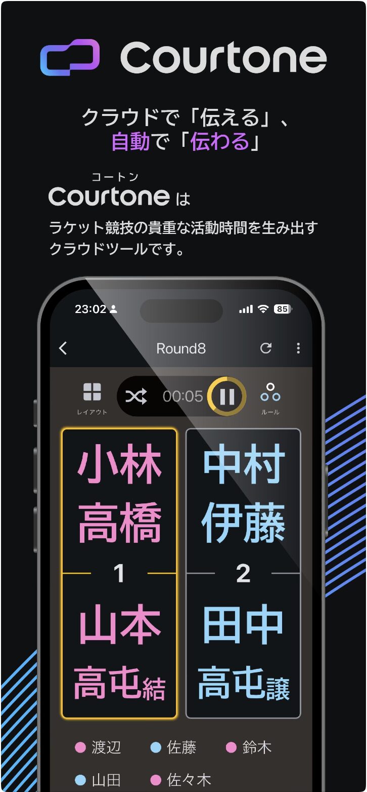 | Courtone | ★★☆☆☆ | 名前の事前入力が必要。ただしQRで一斉登録可能 |